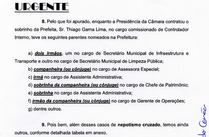 O vereador pede a abertura de inquérito para apuração de nepotismo e possíveis atos de improbidade administrativa pela atual prefeita. Alegado que o sobrinho da prefeita foi contratado para um cargo comissionado de controlador interno na Câmera dos vereadores, enquanto os parentes do presidente foram contratados pela prefeitura. A prática do nepotismo viola a Constituição Federal.