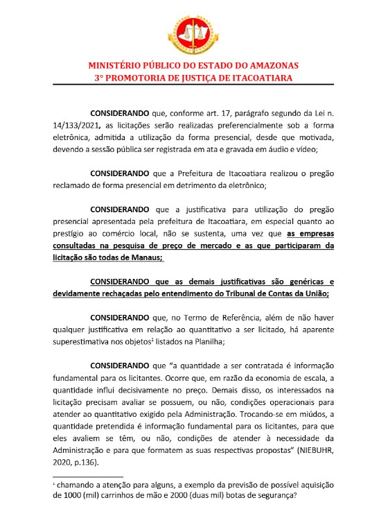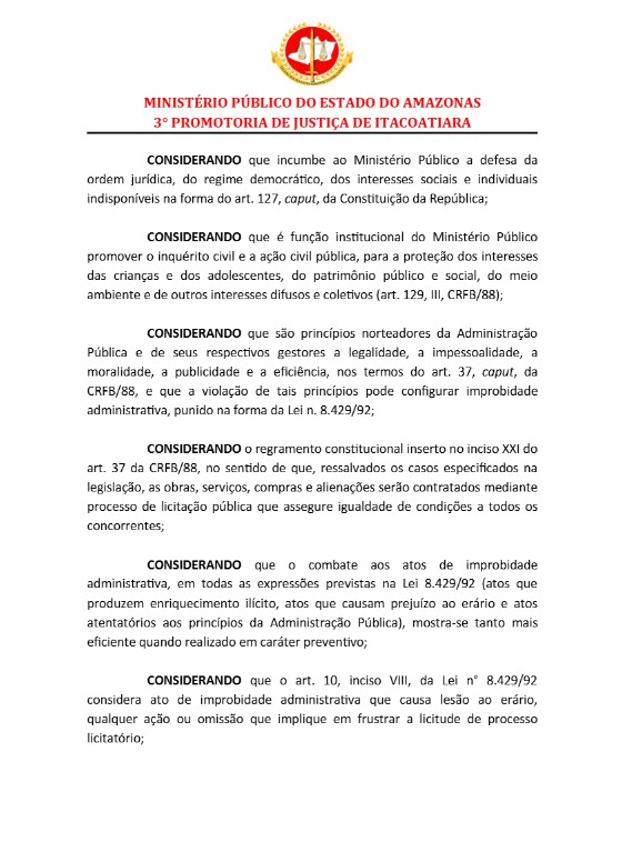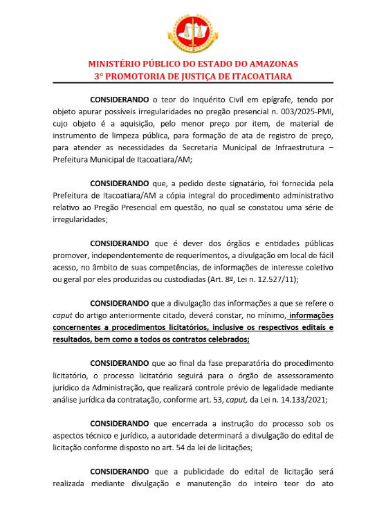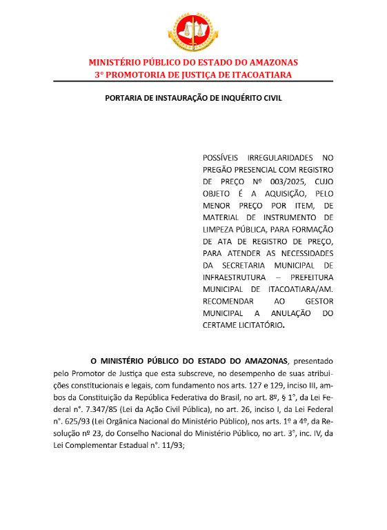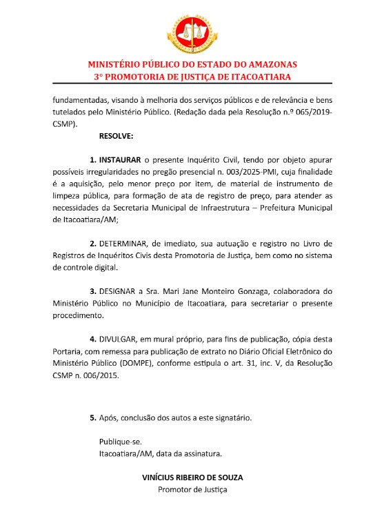 O Promotor de Justiça Vinícius Souza, da 3ª Promotoria de Justiça Município de Itacoatiara, instaurou nesta quarta-feira (12), um inquérito civil público com objetivo de apurar irregularidades em uma licitação de aquisição de materiais para limpeza pública, feito pelo prefeito Mário Abrahim (Republicanos) em Itacoatiara.