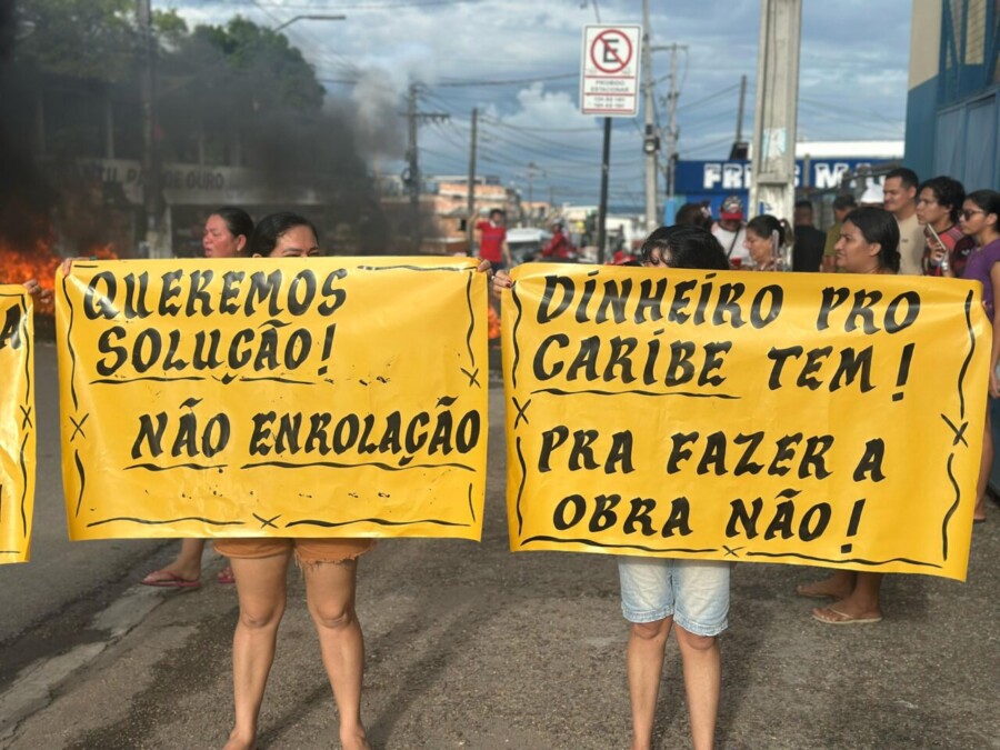 Com faixas e cartazes com palavras de ordem, os moradores fecharam a avenida e cobraram o prefeito David Almeida (Avante), por uma solução imediata para os problemas de infraestrutura no bairro.
