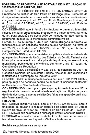 A promotora Kyara Trindade Barbosa decidiu instaurar um inquérito para apurar a denúncia de que o servidor James Baleiro Saraiva, esteja vinculado à estrutura administrativa da Prefeitura de São Paulo de Olivença, recebendo seus salários mas sem cumprir as funções do cargo, caracterizando a prática de “funcionário fantasma”.