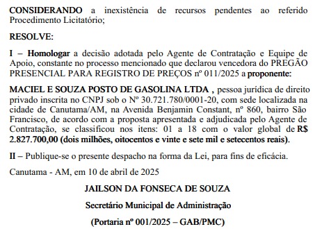 De acordo com o Diário Oficial dos Municípios (DOM), desta última sexta-feira (11), Zé Roberto contratou a empresa MACIEL E SOUZA POSTO DE GASOLINA LTDA, pelo valor total de R$ 2.827.700,00 (dois milhões, oitocentos e vinte e sete mil e setecentos reais), na compra de combustíveis e lubrificantes para a frota de veículos de Canutama.
