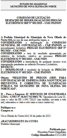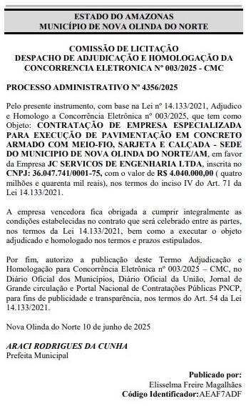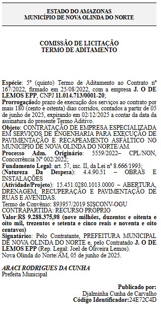 De acordo com o Diário Oficial dos Municípios (DOM), a empresa contratada foi a J. C. SERVIÇOS DE ENGENHARIA LTDA, que vai receber da Prefeitura de Nova Olinda do Norte o valor de R$ 4.040.000,00 (quatro milhões e quarenta mil reais).
