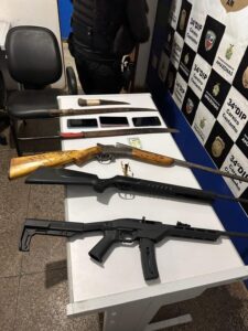 As equipes foram à comunidade e confirmaram a denúncia e identificaram a residência, onde o suspeito morava. O suspeito foi preso em flagrante e durante o procedimento, os policiais localizaram uma espingarda calibre 28, um rifle calibre 22, sete munições, dois terçados, uma faca e três celulares.