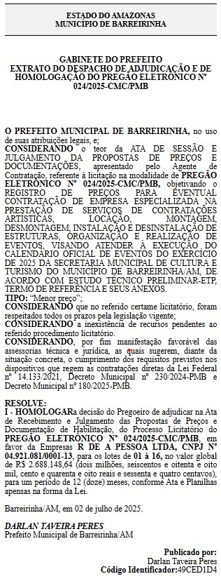 De acordo com o Diário Oficial dos Municípios (DOM), a Prefeitura de Barreirinha vai contratar a empresa R. DE A. PESSOA LTDA, pelo valor total de R$ 2.688.148,64 (dois milhões, seiscentos e oitenta e oito mil, cento e quarenta e oito reais e sessenta e quatro centavos), para o serviço de locação, montagem, instalação, desinstalação e organização de estruturas de eventos.