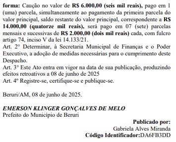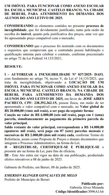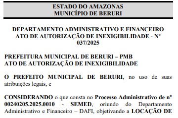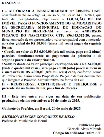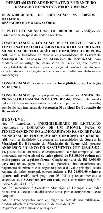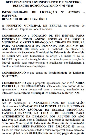 De acordo com o Diário Oficial dos Municípios (DOM) desta quarta-feira (9), Emerson Melo assinou diversos contratos com pessoas físicas da cidade de Beruri, para alugar suas casas em contratos firmados com a Prefeitura com dispensa de licitação.