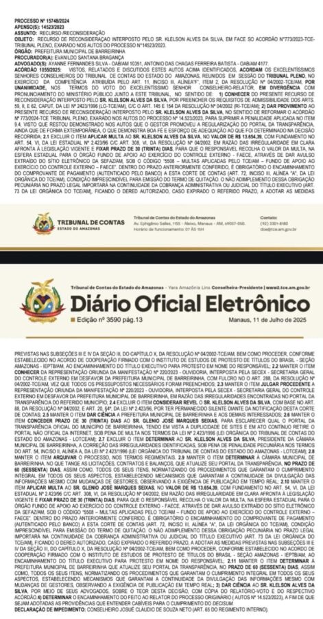 Glênio deve pagar uma multa de R$ 13.654,39 (treze mil, seiscentos e cinquenta e quatro reais e trinta e nove centavos), além de enviar esclarecimentos ao órgão de contas, o motivo de manter o Portal da Transparência de Barreirinha em duplicidade.