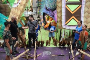 Durante a programação, os alunos participaram de uma palestra com o presidente do Conselho de Arte do Boi Caprichoso, Ericky Nakanome, e realizaram uma visita técnica aos galpões da agremiação azulada, onde puderam identificar resíduos com potencial de reaproveitamento.