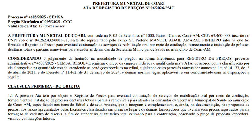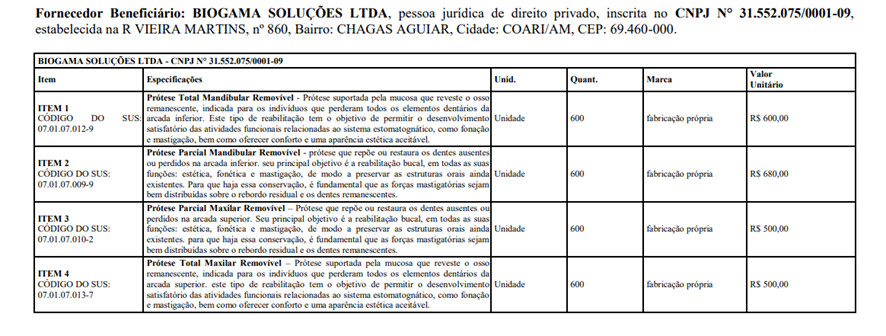 De acordo com o Diário Oficial dos Municípios (DOM), Adail Pinheiro contratou a empresa BIOGAMA SOLUÇÕES LTDA, para fornecer próteses dentárias num valor estimado de mais de R$ 1,36 milhão.