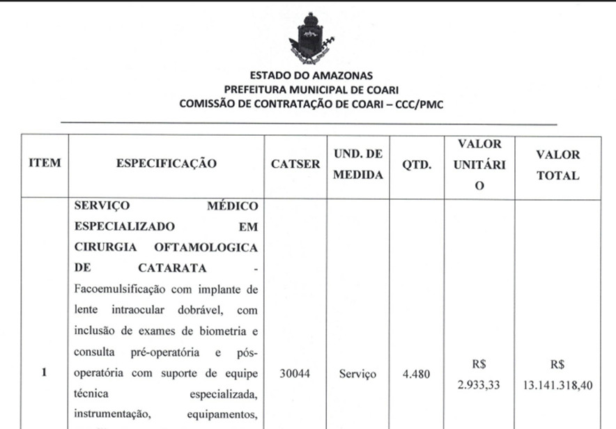 Para o serviço médico especializado de cirurgia oftalmológica de catarata para 2.933 procedimentos ao custo unitário de R$ 4.480, totalizando cerca de R$ 13.141.318,40 (treze milhões, cento e quarenta e um mil, trezentos e dezoito reais e quarenta centavos).