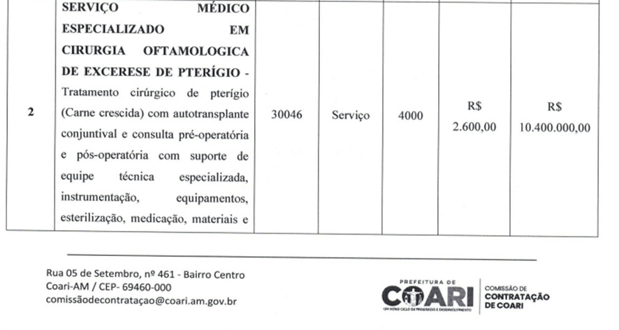 Já para o serviço médico especializado em cirurgia oftalmológica de excerse de pterígio para 4.000 procedimentos ao valor de R$ 2.600, somando o valor de R$ 10.400.000,00 (dez milhões, e quatrocentos mil reais).