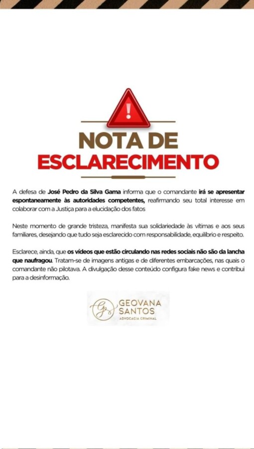 A advogada Geovana Santos, que assumiu a defesa do piloto da lancha que naufragou no Encontro das Águas, José Pedro da Silva Gama, 42 anos, emitiu uma nota nesta terça-feira (24/02), afirmando que ele iria se entregar à Polícia em breve.