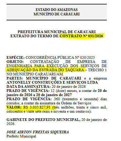 O segundo contrato foi firmado no valor total de R$ 3.035.827,91 (três milhões, trinta e cinco mil, oitocentos e vinte e sete reais e noventa e um centavos), para executar serviços de adequação da Estrada do Taquara em Carauari.