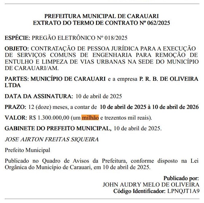De acordo com o Diário Oficial dos Municípios (DOM) publicado na última sexta-feira (11), a empresa P. R. B. DE OLIVEIRA LTDA, pelo valor de R$ 1.300.000,00 (um milhão e trezentos mil reais) para prestar os serviços de limpeza e remoção de entulho nas vias de Carauari.