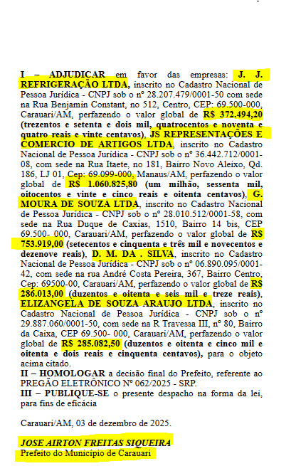 Finalizando o ano de 2025, o prefeito Airton Siqueira (MDB), resolveu gastar mais de R$ 2,7 milhões em cinco empresas, para a compra de material de expediente para segundo ele, atender as demandas da Prefeitura de Carauari, no interior do Amazonas.