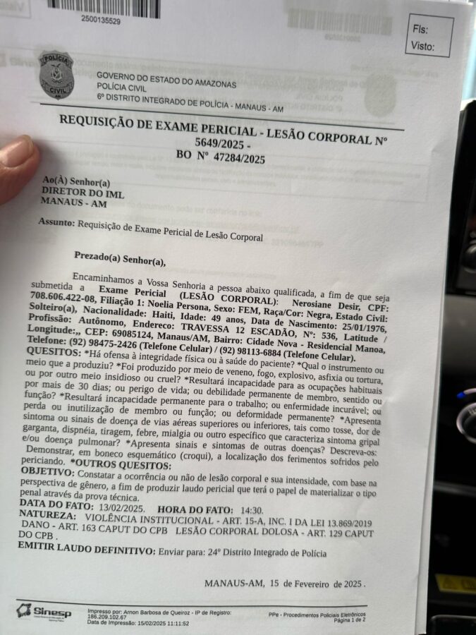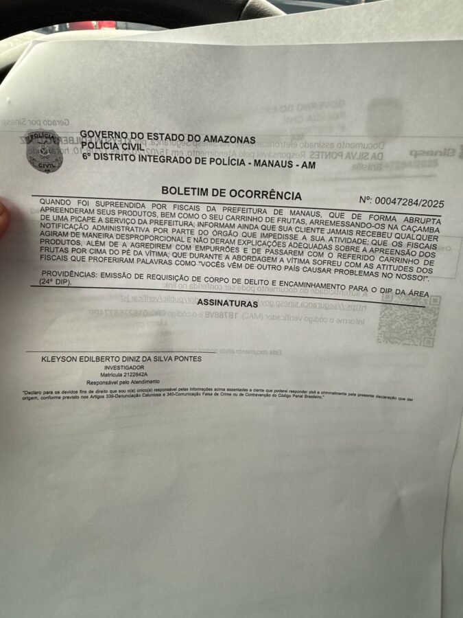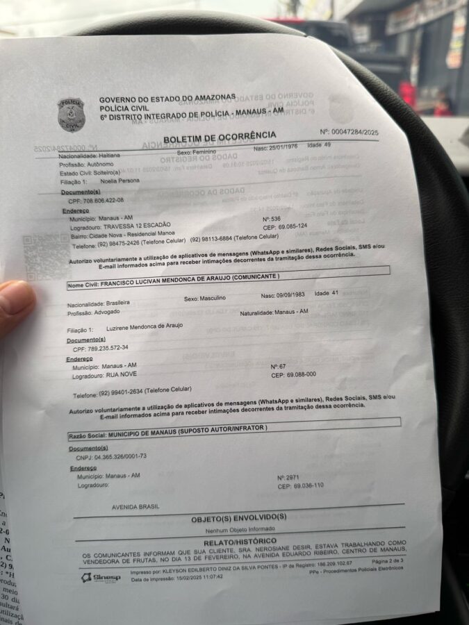 Acusada pela Prefeitura de Manaus e por David Almeida (Avante), de ter sido notificada pelos fiscais da Secretaria Municipal de Agricultura, Abastecimento (Semacc), e não sair quando ordenada, a vendedora ambulante haitiana Nerosiane Desir, foi até uma delegacia fazer um Boletim de Ocorrência nesta sexta-feira (15), acompanhada de dois advogados.