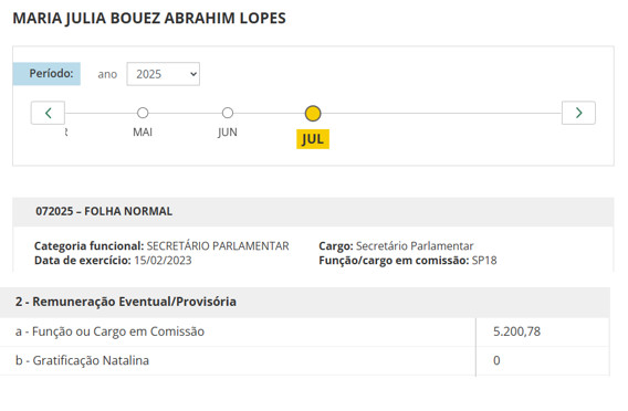 De acordo com o SAPL da Câmara Federal, Maria Júlia Abrahim, está alocada como secretária parlamentar no gabinete de Adail Filho, com um salário de R$ 5 mil, com um auxílio de R$ 1.784,42.