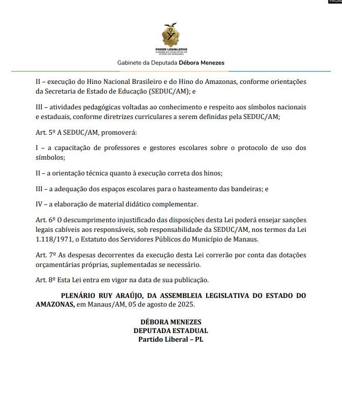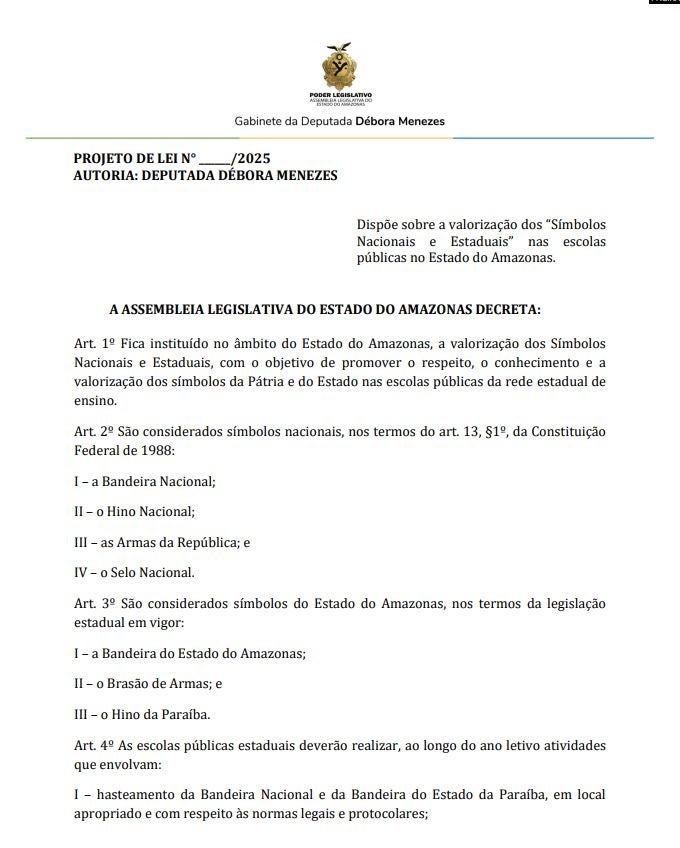 Débora Menezes copiou um Projeto de Lei que buscava instituir a valorização de Símbolos Nacionais e Estaduais nas escolas públicas da rede estadual de ensino, mas ao tentar tornar o hino do Amazonas um símbolo, ela pede que o hino da Paraíba seja o beneficiado.