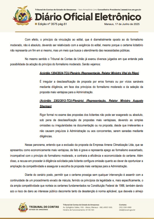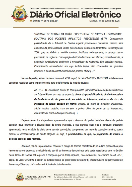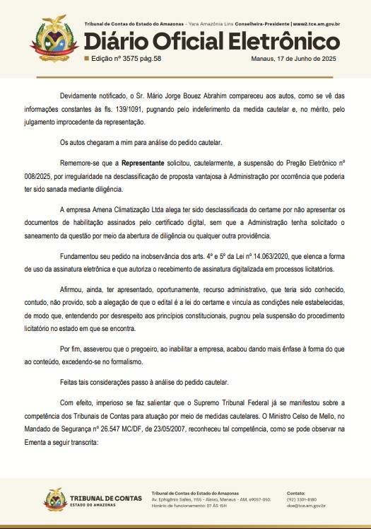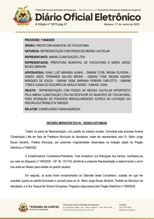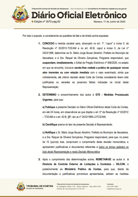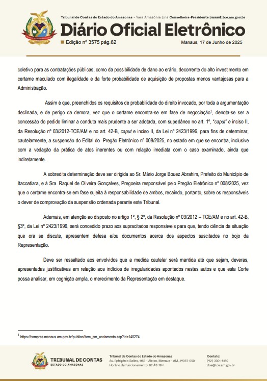 ” … determinar ao Sr. Mário Jorge Bouez Abrahim, Prefeito do Município de Itacoatiara, e à Sra. Raquel de Oliveira Gonçalves, Pregoeira responsável, que suspendam, imediatamente, o Edital de Pregão Eletrônico nº 008/2025, no estado em que se encontra, inclusive sendo-lhes vedada a prática de quaisquer novos atos inerentes ou com relação imediata com o caso examinado, ainda que indiretamente, até ulterior decisão desta Corte de Contas constatando terem sido justificadas ou sanadas as possíveis falhas indicadas na inicial desta Representação”, diz o documento publicado pelo TCE-AM.