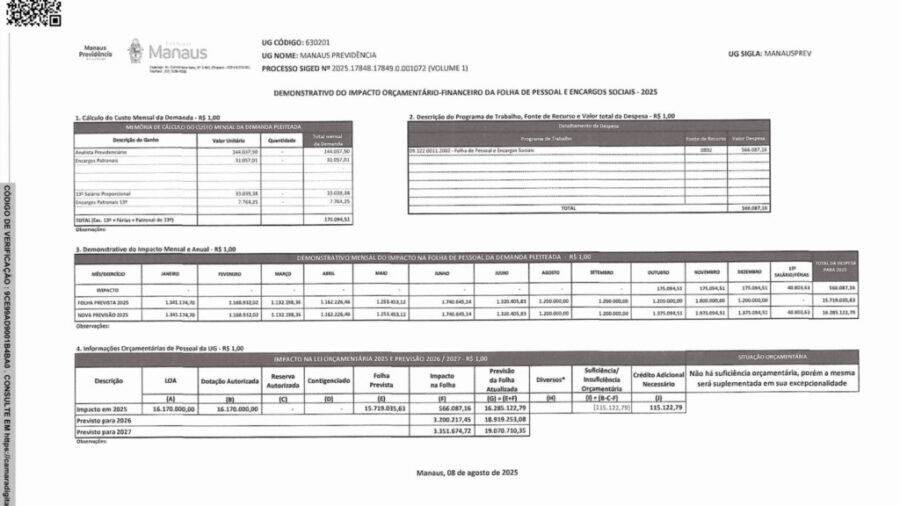 Para 2026, o impacto da folha será de R$ 3,2 milhões. Para o próximo ano, o valor total dos gastos com pessoal da autarquia é estimado em R$ 18,9 milhões.