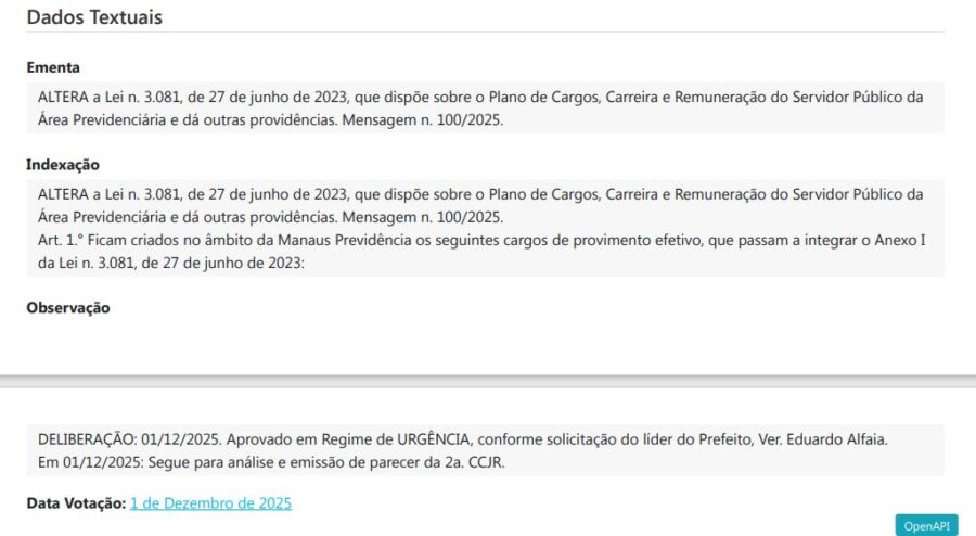 O projeto de lei 816/2025 cria um cargo na Especialidade Administração na ManausPrev; oito cargos na área Administrativa; três cargos de Auditoria; um cargo de na área de Psicologia; dois cargos para Tecnologia da Informação; um para Analista de Dados; e ainda dois na especialidade de Investimentos.