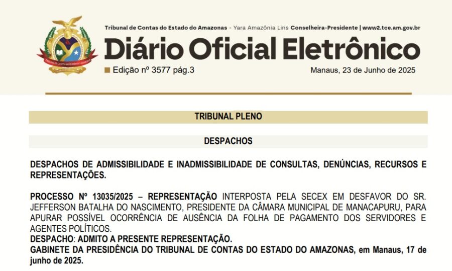 O Tribunal de Contas do Estado do Amazonas acatou um pedido da Secretaria de Controle Externo (Secex), para apurar irregularidades cometidas pelo vereador presidente da Câmara Municipal de Manacapuru, Jefferson Batalha do Nascimento (Republicanos), por irregularidades na folha de pagamento de servidores da casa legislativa.
