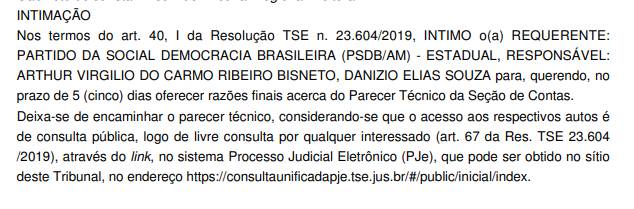 O Tribunal Regional Eleitoral do Amazonas (TRE-AM) deu um prazo de cinco dias para que o Partido da Social Democracia Brasileira (PSDB), que era comandada pelo ex-deputado Arthur Bisneto, por irregularidades nas prestações de contas do exercício 2019, quando o político comandava o partido.