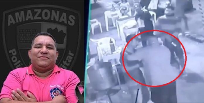 Imagens de uma câmera de segurança registrou o momento em que o PM foi brutalmente assassinado por homens armados que chegaram no local.