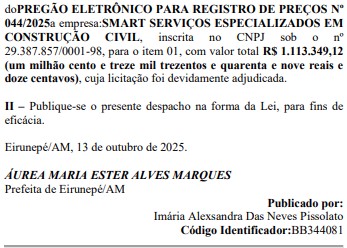 De acordo com o Diário Oficial dos Municípios (DOM), desta sexta-feira (17/10), Áurea Marques contratou a empresa SMART SERVIÇOS ESPECIALIZADOS EM CONSTRUÇÃO CIVIL, pelo valor total de R$ 1.113.349,12 (um milhão cento e treze mil trezentos e quarenta e nove reais e doze centavos).