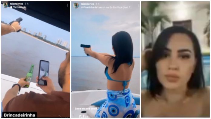 .Em seguida, os dois homens aparecem ao som de “baile de favela”.Um deles dispara um tiro para o alto enquanto o outro filma o momento. “Brincadeirinha”, disparou Taiana na legenda.
