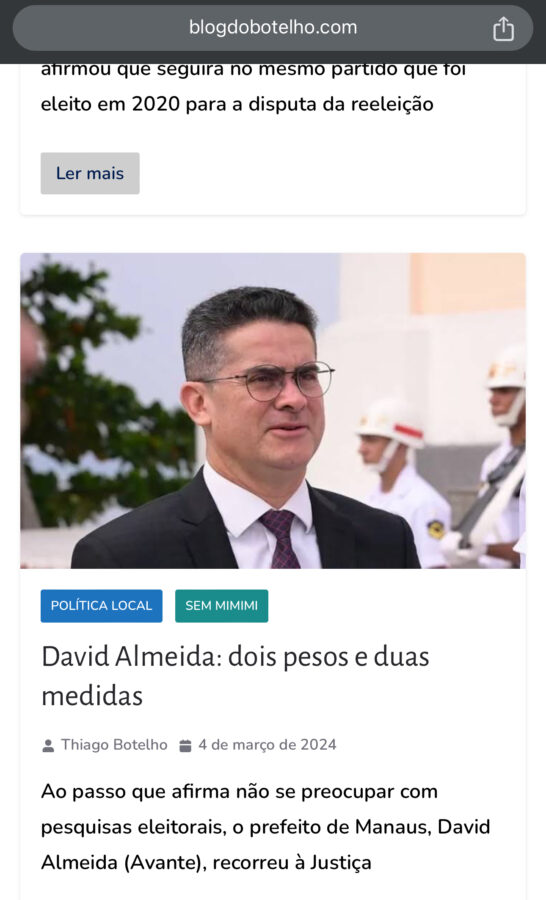 Neste ano e no anterior, o Blog do Botelho já publicou dez matérias favoráveis a Caio, uma delas, que o chama de “Desejado e Fiel”. Tudo isso, desde que André foi eleito presidente da Casa e sem o criticar em nenhum momento. Já contra David, foram 11 conteúdo negativos e nenhuma positiva, uma delas que cita “dois pesos e duas medidas”, mesmo tratamento dado ao jornalista sobre as duas personalidades políticas.