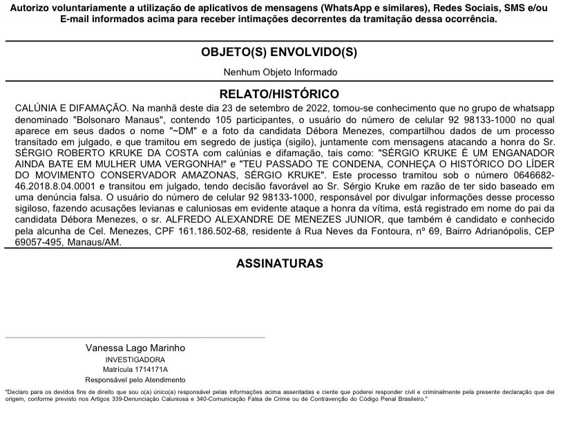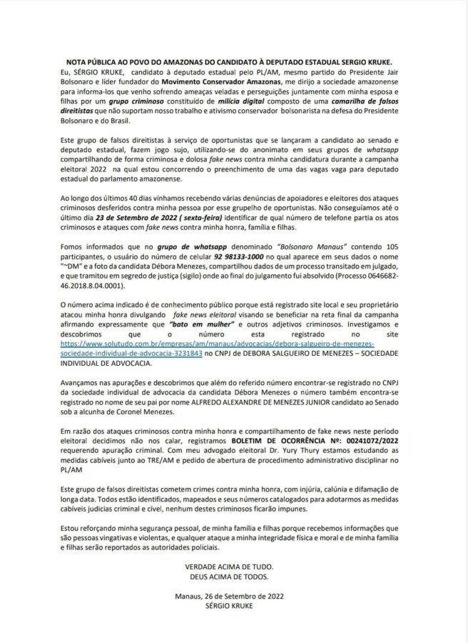 Ainda segundo Sérgio Kruke, o grupo vem buscando lhe difamar, compartilhando informações de que ele seria um agressor de mulheres, entre outros crimes hediondos. Os administradores do grupo que vem divulgando as informações, possuem a foto da também candidata Débora Menezes, filha do Coronel Menezes, que busca uma vaga na Assembleia Legislativa do Amazonas, assim como Kruke.