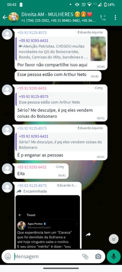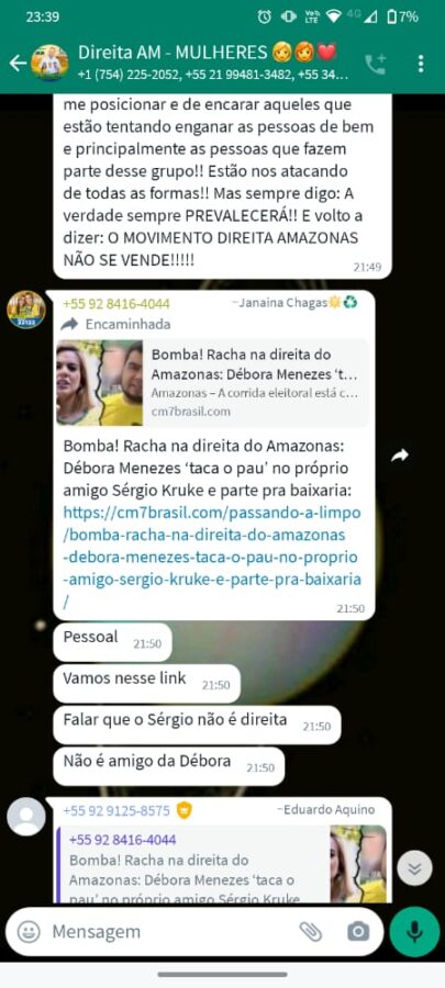Tivemos acesso a alguns prints, onde mostra o grupo ‘Bolsonaro Amazonas’ onde aparecem as acusações feitas ao Sérgio Kruke.