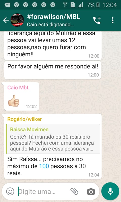 Em outra mensagem, uma líder comunitária identificada no grupo de whatsapp como Raíssa, escreve: ‘’Gente? Tá mantido os 30 reais pro pessoal? Fechei com a liderança aqui do mutirão e essa pessoa vai levar umas 12 pessoas, não quero furar com ninguém!!’’