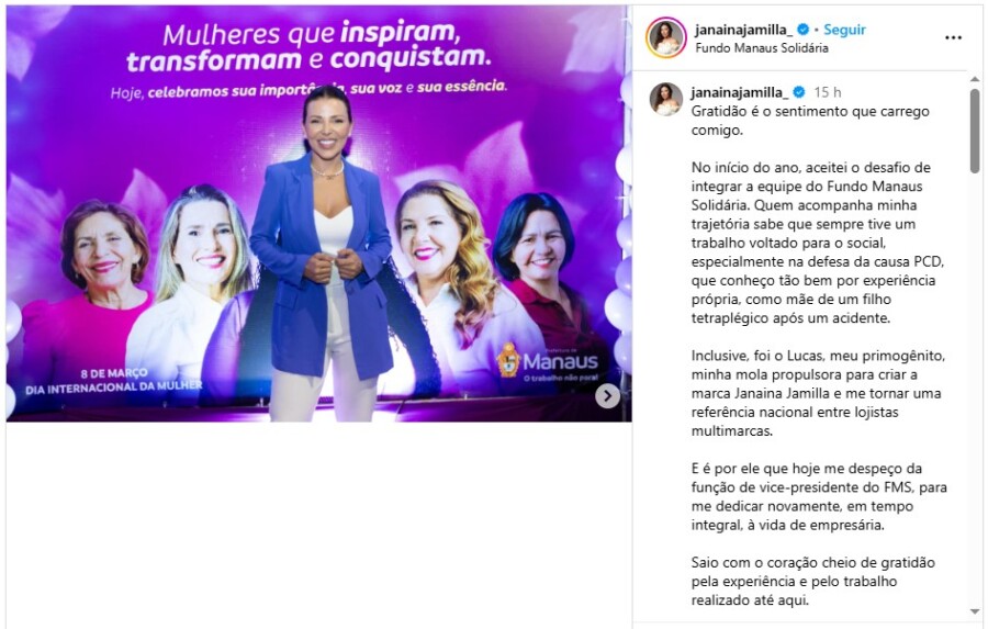 A empresária Janaina Jamilla (Avante), melhor amiga da primeira-dama de Manaus Izabelle Fontenelle, anunciou a sua saída do Fundo Manaus Solidário (FMS).