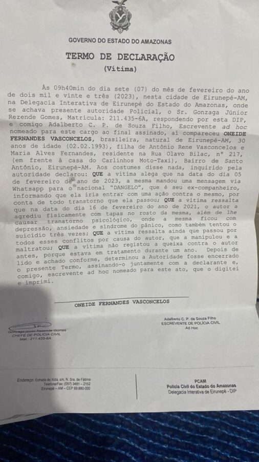 Ao saber sobre o processo, Dangelo Falcão passou a ameaçar e a caluniar a ex-companheira. O caso agora segue para a justiça.
