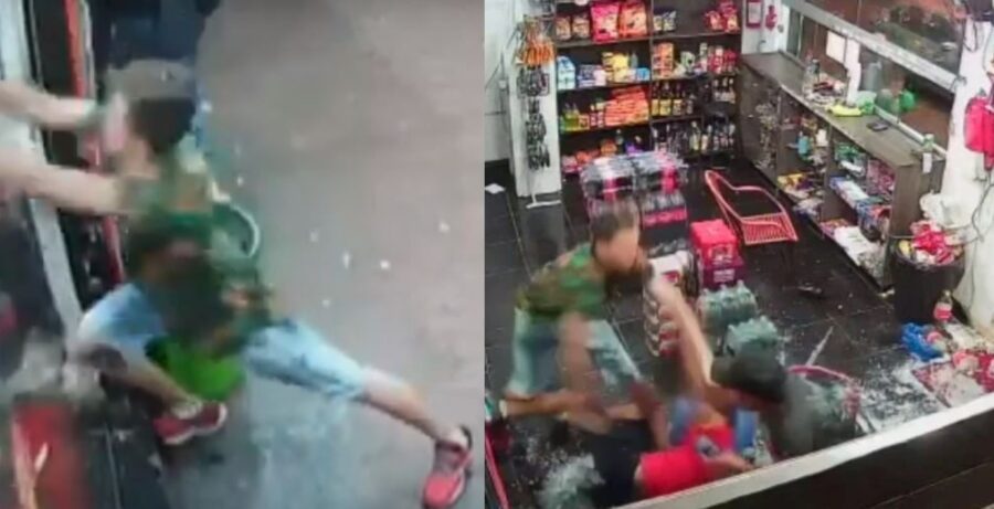 Câmeras de segurança flagraram o momento em que o cliente, irritado, empurra a porta de vidro e parte para cima das vítimas, que são irmãos.