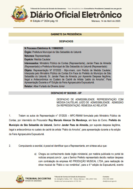 O Tribunal de Contas do Estado do Amazonas (TCE-AM), acatou um pedido de representação com medida cautelar, contra o prefeito Jander Paes de Almeida (UB), por suposta despesa ilegítima, ilegal e antieconômica no pagamento do cantor ‘Pablo do Arrocha’, em show no município de São Sebastião do Uatumã.