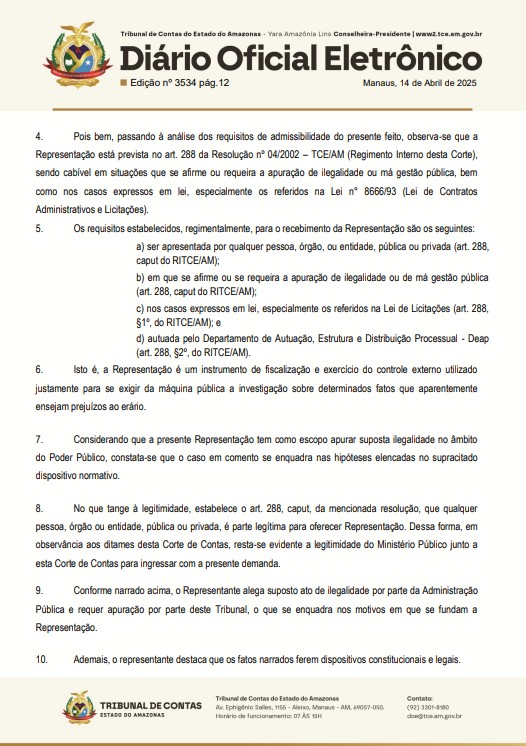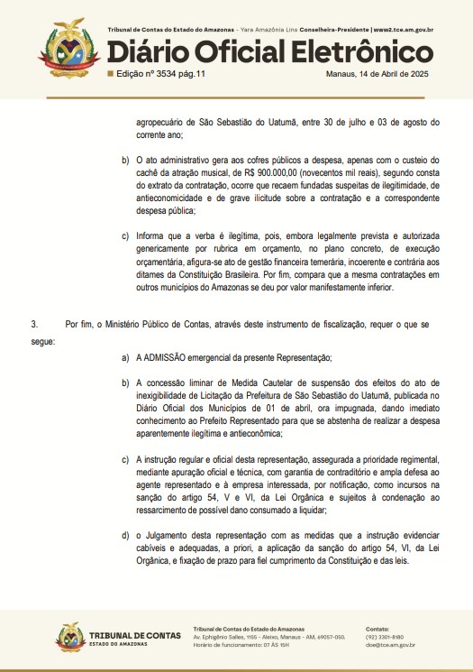 Informa que a verba é ilegítima, pois, embora legalmente prevista e autorizada genericamente por rubrica em orçamento, no plano concreto, de execução orçamentária, afigura-se ato de gestão financeira temerária, incoerente e contrária aos ditames da Constituição Brasileira. Por fim, compara que a mesma contratações em outros municípios do Amazonas se deu por valor manifestamente inferior”, diz o documento enviado ao TCE-AM.