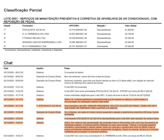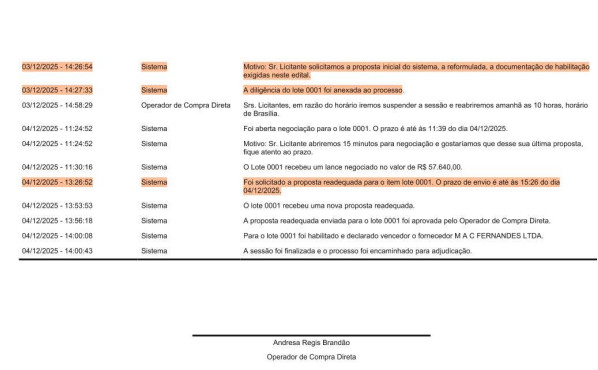 De acordo com a denúncia apresentada ao órgão de contas, a Dispensa Eletrônica nº 009/2025, foi direcionada para a empresa MAC FERNANDES LTDA, já que no momento do anúncio da licitação, as empresas tinham apenas 15 minutos para a apresentação de propostas e documentos de habilitação.