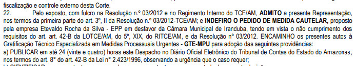 O Tribunal de Contas aceito o pedido de investigação, mas não concedeu a suspensão imediata do certame, mesmo com robustas provas de direcionamento de licitação e fraude para que a MAC FERNANDES LTDA fosse beneficiada.