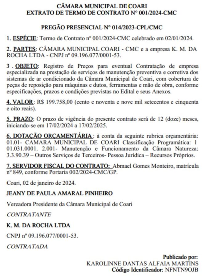 O contrato com a empresa K. M. DA ROCHA LTDA, foi homologado nesta terça-feira (2), no Diário Oficial dos Municípios (DOM), sendo assinado pela vereadora Jeany de Paula Amaral Pinheiro, que é tia do deputado federal Adail Filho.
