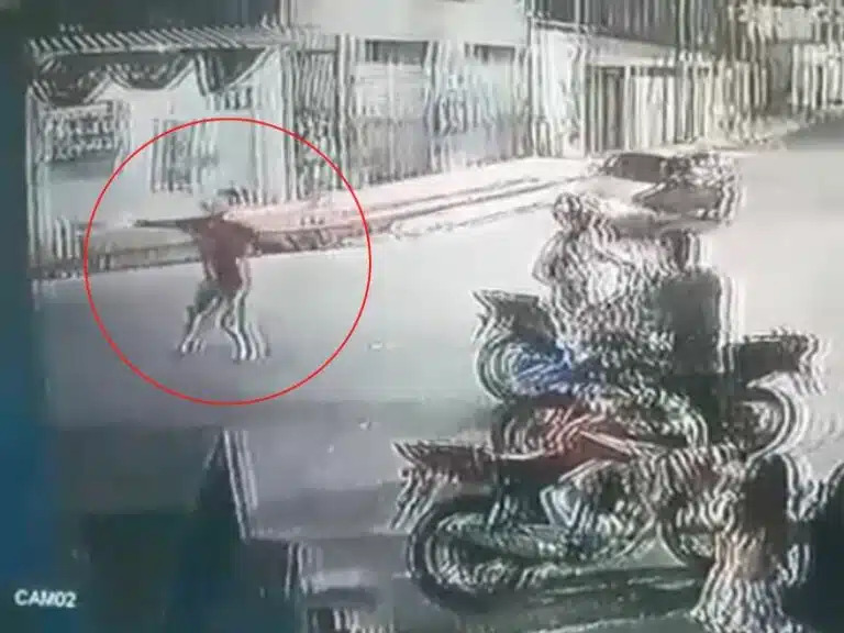 Nas imagens divulgadas pela Polícia, um grupo de pessoas estavam em frente a um mercadinho, quando de repente são abordados por dois homens em uma motocicleta anunciando o assalto.