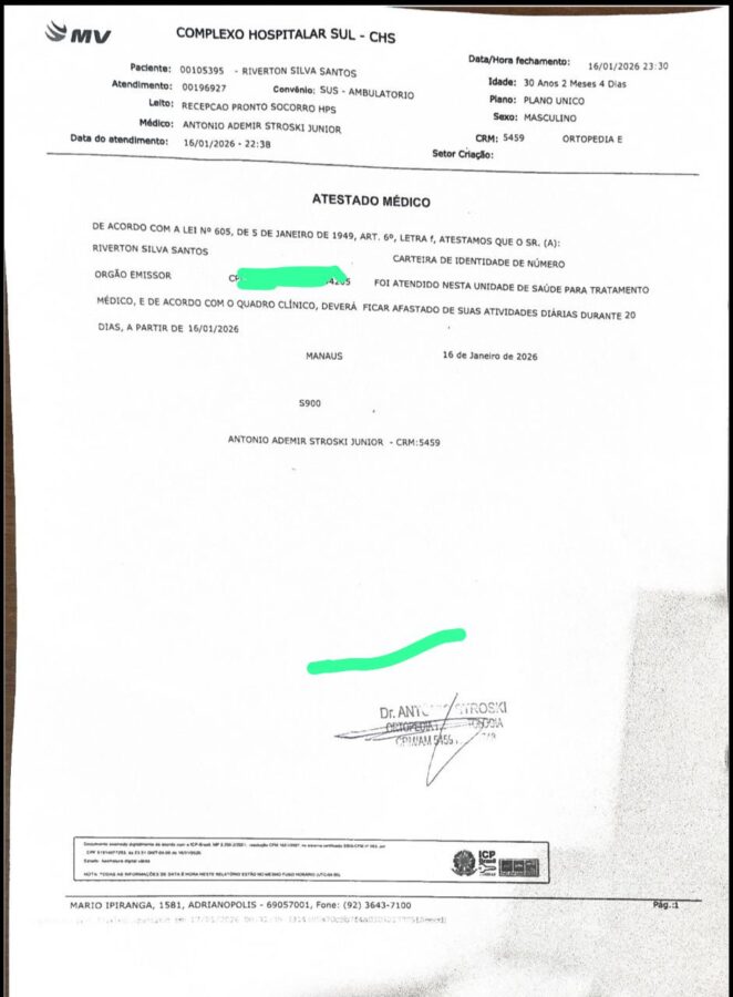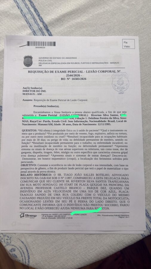 A vítima foi identificada como Riverton Silva Santos, de 30 anos, brasileiro, motoboy e pai de três filhas. Ele sofreu lesões no pé e na perna, com inchaço e dores, ficando impedido de trabalhar. Já são cinco dias sem qualquer renda, e há previsão médica de afastamento por até 20 dias. Riverton depende exclusivamente do trabalho com a motocicleta para sustentar a família.