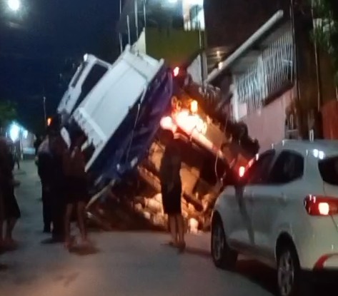 Um caminhão coletor de lixo foi engolido por uma cratera nesta terça-feira (07/04), ao passar pela Rua Raimundo Maia, comunidade Parque São Pedro, bairro do Tarumã, zona Oeste da capital amazonense.