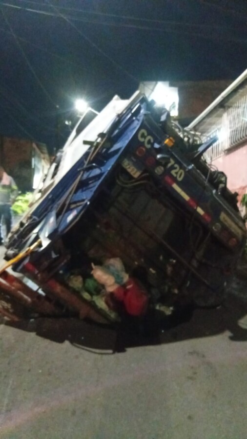 Caminhão coletor de lixo cai em cratera no Parque São Pedro