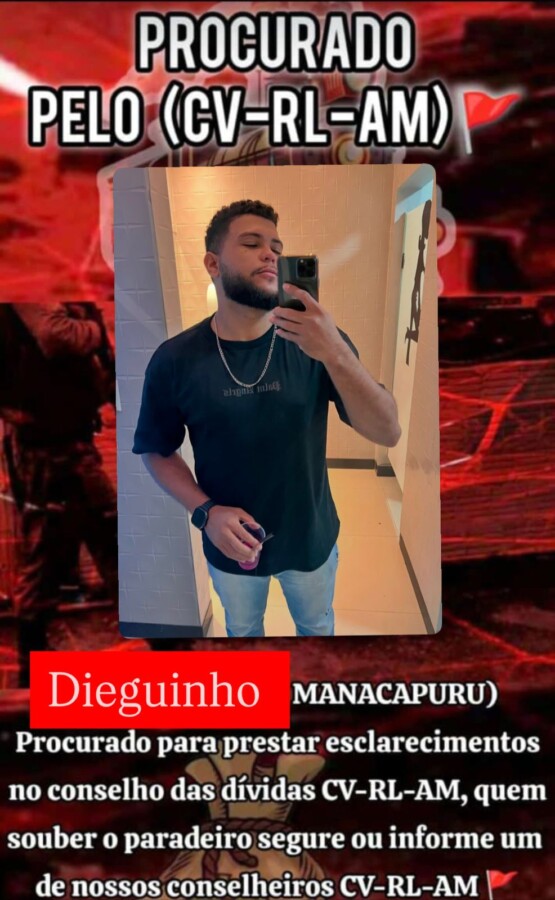 “(Procurado pelo CV-RL-AM). Dieguinho, de Manacapuru, procurado para prestar esclarecimentos no conselho das dívidas CV-RL-AM, quem souber o paradeiro segure ou informe um de nossos soldados”, dizia o aviso da facção.