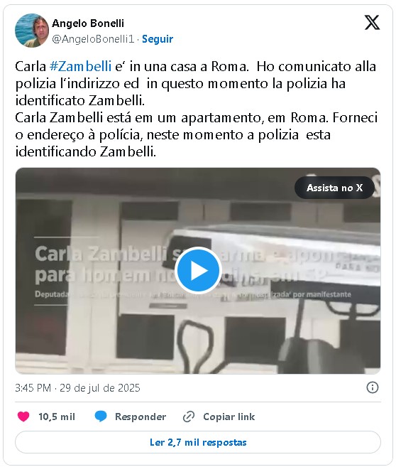 “Carla Zambelli está em um apartamento em Roma. Dei o endereço à polícia, e a polícia já está identificando Zambelli”, publicou Bonelli na rede X.