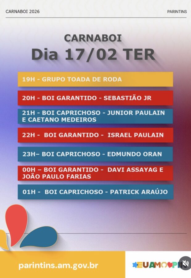 A Prefeitura de Parintins publicou a programação do Carnaboi que será na terça-feira, 17 de fevereiro, reunindo atrações dos bois-bumbás Garantido e Caprichoso em uma grande celebração da cultura popular parintinense.