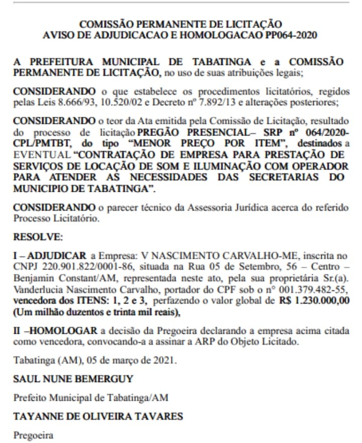 O despacho de homologação, isto é, validação do processo de licitação e habilitação da empresa vencedora do certame, foi publicado no Diário Oficial do Município -DOM, na última terça-feira (9), o despacho já estava assinado desde o dia 5 pelo por Saul.