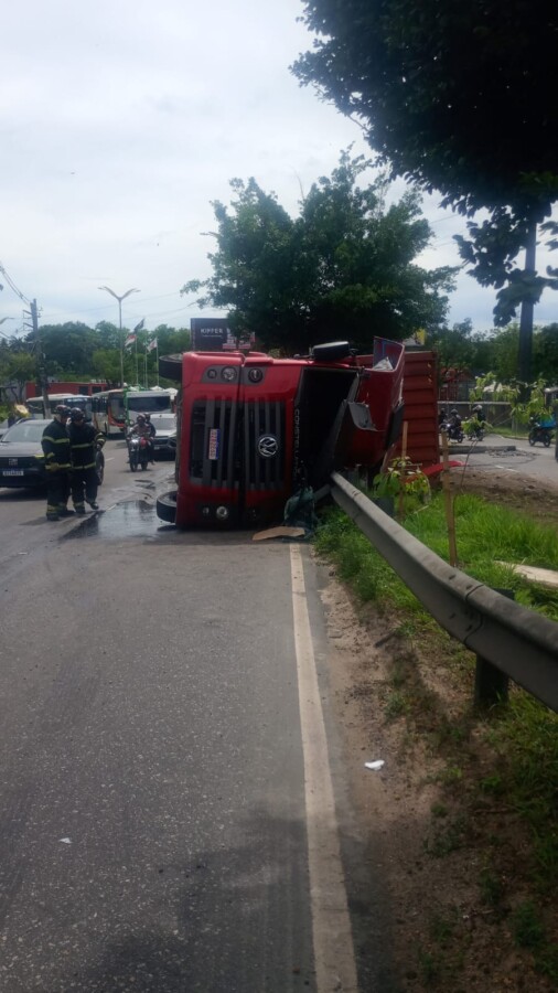 Uma carreta tombou nesta quarta-feira (08/04), na Avenida Cosme Ferreira, bairro do Coroado, zona Leste de Manaus.